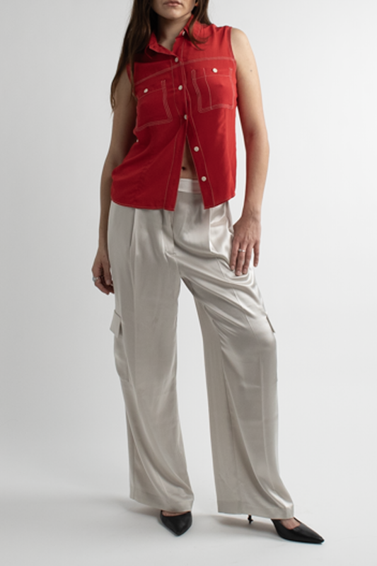 Vintage Red Sleeveless Silk Button Down with Stitching