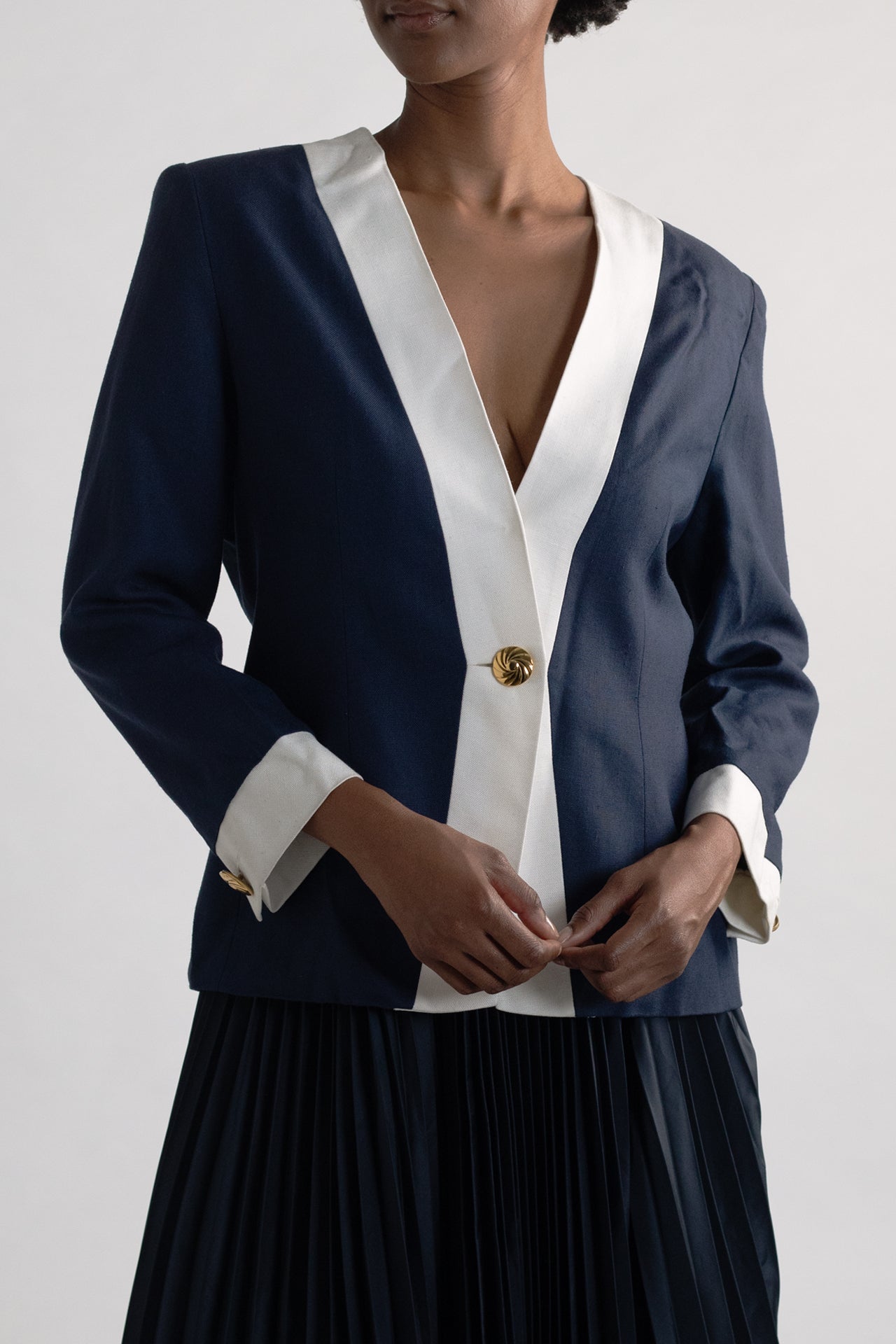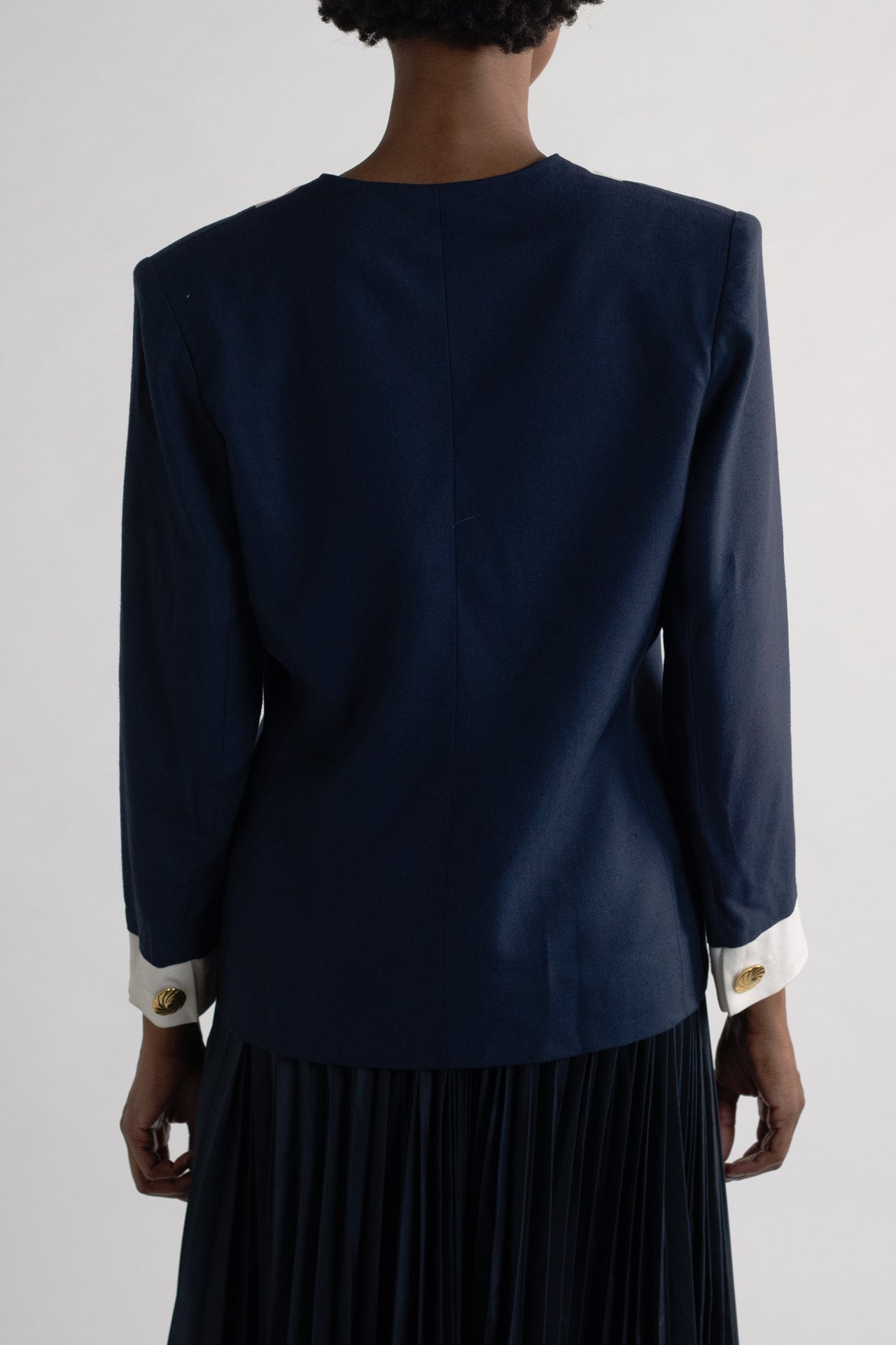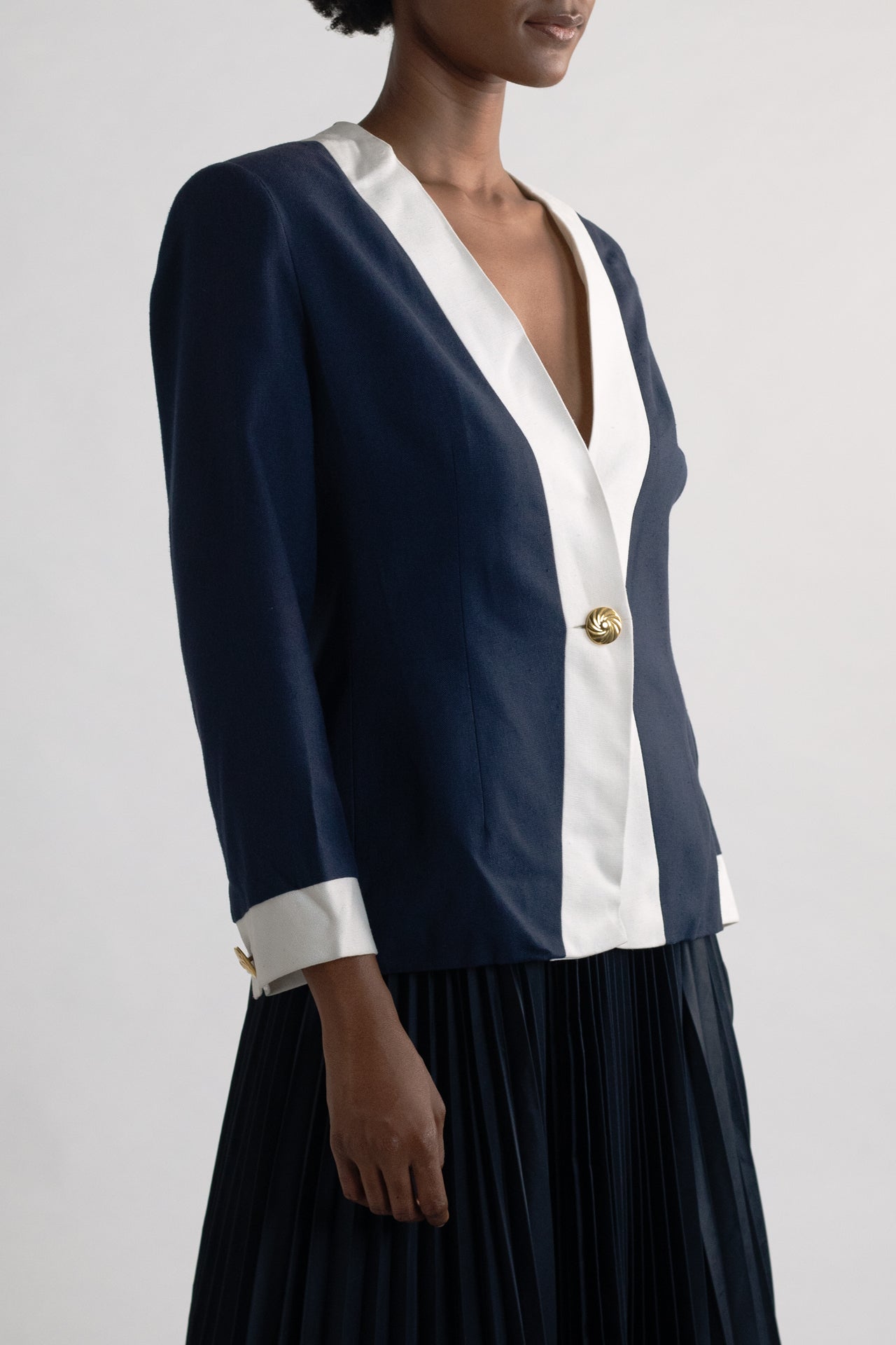 Elevate your wardrobe with this Givenchy Navy Blue Blazer with White Trim. A refined piece crafted from high-quality fabric, this blazer features a sharp, boxy fit that provides comfort and structure.